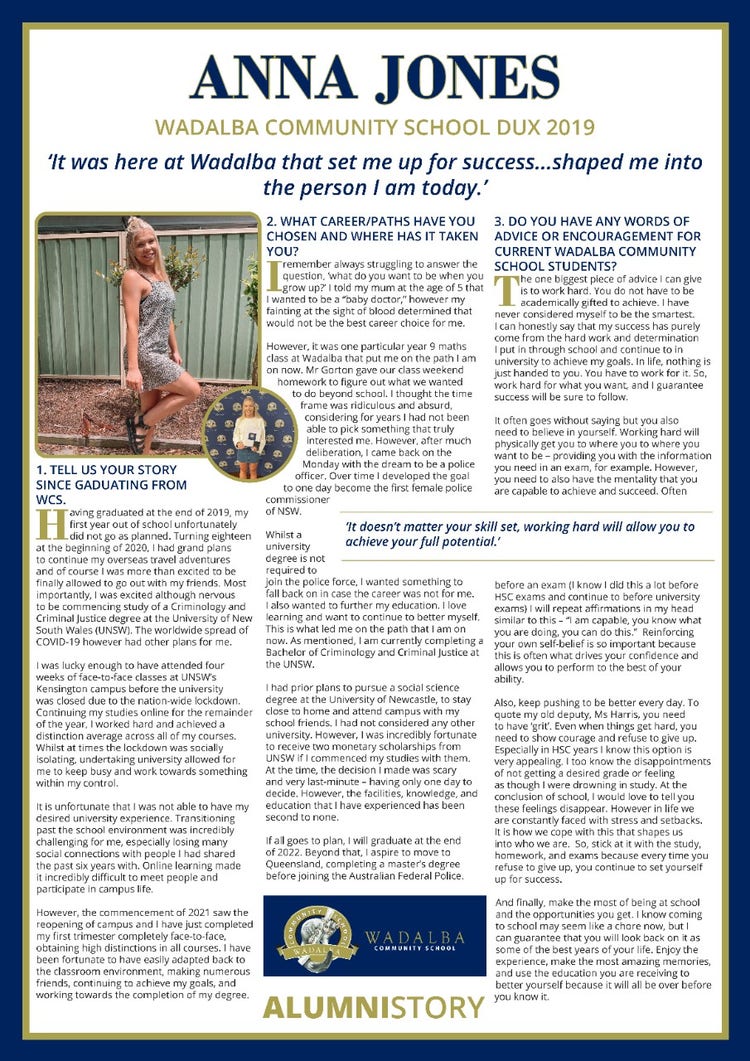 We are excited to celebrate the achievements and stories of our former students. Through the WCS Alumni, we connect with past graduates to share their experiences at Wadalba Community School and the many different paths they have followed since finishing school.